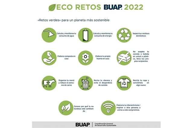 La dinámica de los eco retos BUAP incluye la publicación de infografías, videos, experiencias y datos, a fin de que los participantes conozcan sobre temas ambientales, hacer conciencia e intercambiar experiencias con otras personas que también se comprometen con el cuidado del entorno natural.