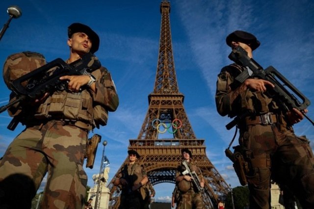 Se le puede ver por encima de los anillos olímpicos instalados en la torre con motivo de los Juegos Olímpicos de París, cuya ceremonia de clausura tendrá lugar el domingo por la noche en el Estadio de Francia, en la periferia de la capital.