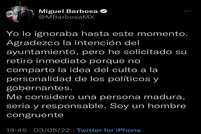 “Esta noche me enteré de la reciente colocación de una estatua alusiva a mi persona colocada en la explanada en la presidencia municipal de Zinacatepec, lo cual fue resuelto por acuerdo de su Cabildo. Yo lo ignoraba hasta este momento. Agradezco la intención del ayuntamiento, pero he solicitado su retiro inmediato porque no comparto la idea del culto a la personalidad de los políticos y gobernantes. Me considero una persona madura, seria y responsable. Soy un hombre congruente”, señaló.