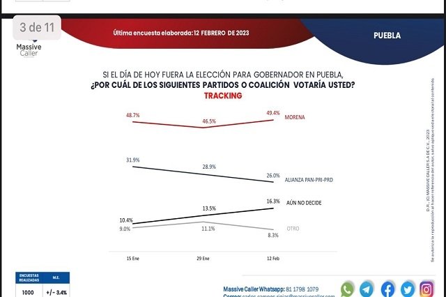 En la encuesta elaborada el 12 de febrero de 2023, el 39.9 por ciento de los poblanos conoce a Eduardo Rivera Pérez, el 37.1 por ciento ubica a Alejandro Armenta Mier, y el 32 por ciento sabe de Claudia Rivera Vivanco, exalcaldesa morenista de la capital.
