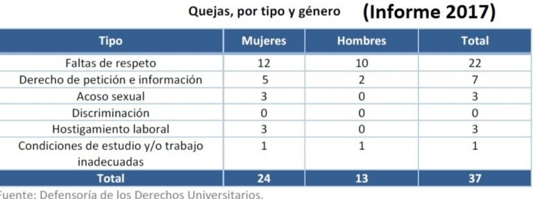 Tan sólo se tiene un reporte de 37 quejas, de las cuales 26 las formularon estudiantes, 8 fueron presentadas por académicos y los 3 restantes por trabajadores no académicos.