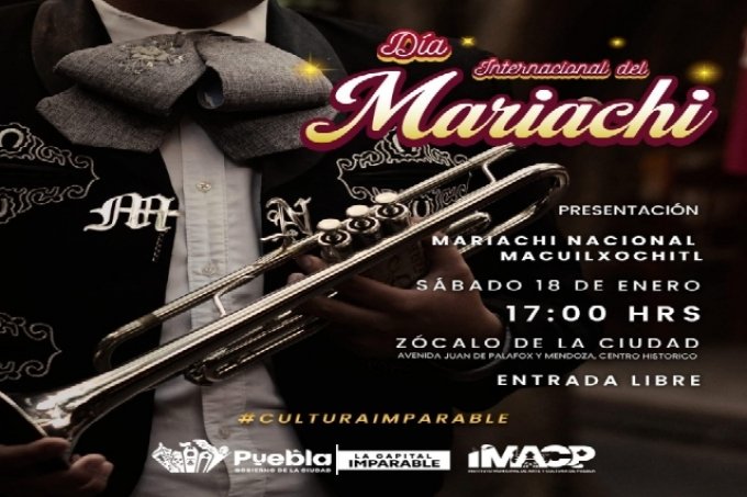 En el marco del Día Internacional del Mariachi, el sábado 18, se presentará el Mariachi Nacional MacuilXóchitl, en el Zócalo a las 17:00 horas, mientras que el domingo 19 de enero, “La Chula de Puebla”, Alma Delia, cautivará con su voz a las 15:00 horas.