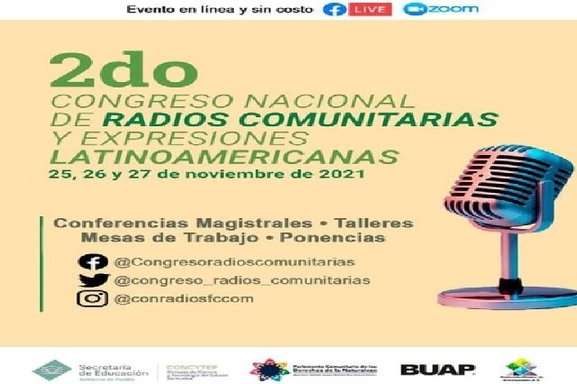 Con el objetivo de integrar, profesionalizar y capacitar a las diversas emisoras ciudadanas del país y compartir experiencias con otras del extranjero, se llevará a cabo el Segundo Congreso Nacional de Radios Comunitarias y Expresiones Latinoamericanas, del 25 al 27 de noviembre, de forma virtual y gratuita: un foro que reunirá voces calificadas para disertar sobre la radio comunitaria y sus alcances.