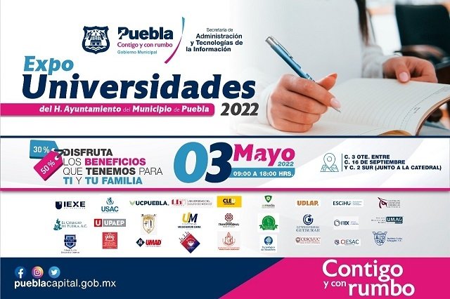 El Zócalo de la Ciudad de Puebla será sede de la “Expo Universidades 2022”, un corredor de oferta educativa que la Secretaría de Administración y Tecnologías de la Información del Ayuntamiento de Puebla trae para compartir con la ciudadanía, contará con diversos planes de estudio que se ajusten a las demandas de carreras académicas.