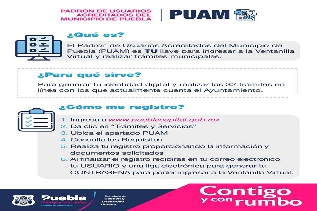 El Padrón de Usuarios Acreditados del Municipio de Puebla (PUAM) es la llave para ingresar a la Ventanilla Virtual y realizar trámites municipales.