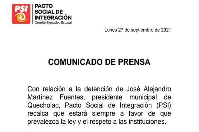 Fueron minutos más tarde, cuando el partido que lo representaba, PSI dio a conocer un comunicado de prensa, en donde se mencionaba que respetarían el desarrollo de la investigación indicando que su postura era a favor de que prevaleciera la ley y el respeto a las instituciones.