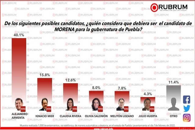 Con un margen de error de apenas el 3.8 por ciento, la encuestadora Rubrum pone a la cabeza a Morena y el senador poblano Alejandro Armenta para ganar la contienda electoral del 2024 a la gubernatura de Puebla.